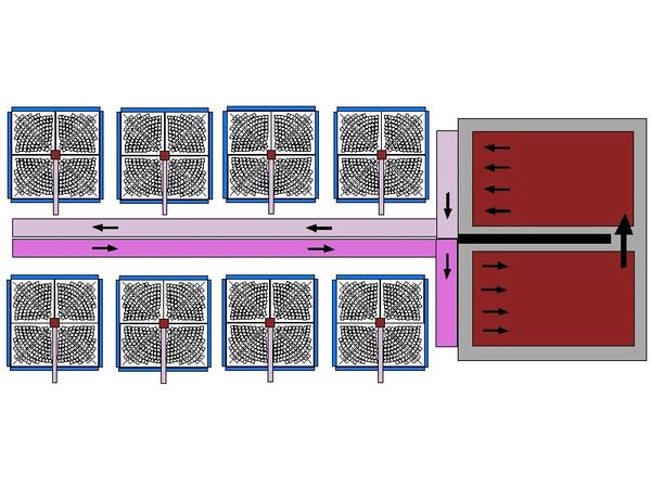 The receivers will generate 1200 F. hot air that flows through ducts to the Adobe/Salt thermal storage blocks designed to hold 24 hours of thermal energy to operate the hydraulic engine system.